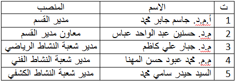 ويضم قسم النشاط الرياضي مجموعة من حملة الشهادات العليا الدكتوراه والماجستير فضلا عن مجموعة من حملة شهادات البكلوريوس وباختصاصات مختلفة رياضية وفنية.